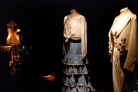 Poi cominciano una serie di sale, tutte assolutamente buie (difficilissimo fare le fotografie in quella penombra, ma qualcosa sono riuscita a catturare comunque), con locandine, altri filmati e materiale di repertorio, ed una più grande dalla cui ombra densa emergono costumi di scena, oggetti d’epoca e specchi. L’insieme non è privo di una certa suggestione ma, per quanto riguarda i vestiti, se ne vedono di molto più belli nei negozi e negli spettacoli in generale…i vestiti da ballo e da feria possono essere stupendi e originali, oppure striminziti o kitch, si trova un po’ di tutto, anche se solitamente quelli usati per la danza sono più sobri e lineari rispetto a quelli indossati per le feste…diciamo che questi non mi hanno fatto impazzire.